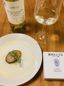 蝦夷あわびと北海道のブドウ100%で造られた、はこだてワインの北海道100 ソーヴィニヨン・ブランを合わせてみたくなり、ペアリングしました。